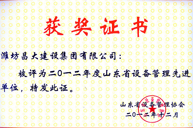 集團(tuán)公司榮獲山東省設(shè)備管理先進(jìn)單位 由山東省設(shè)備管理協(xié)會(huì)組織評(píng)選的山東省設(shè)備管理先進(jìn)單位和先進(jìn)個(gè)人評(píng)選結(jié)果公布。全省有56家企業(yè)被評(píng)為優(yōu)秀單位,62家單位被評(píng)為先進(jìn)單位。集團(tuán)公司榮獲2012年度山東省設(shè)備管理先進(jìn)單位稱號(hào)。