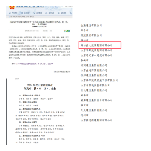 近日,山東省住房和城鄉(xiāng)建設廳發(fā)布了《關于公布2024年度山東省建筑業(yè)領先市、縣(市區(qū))、企業(yè)的通知》(魯建建管字[2025]5號)。集團公司被評為2024年度山東省建筑業(yè)領先企業(yè)。
